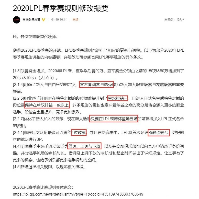 在不久之前英豪联盟赛事官方就2020LPL春季赛规矩进行了必定的修正,除了奖金相较从前有所提高之外,还对LPL工作选手的门槛有所改动,具体的修正内容如下图所示。