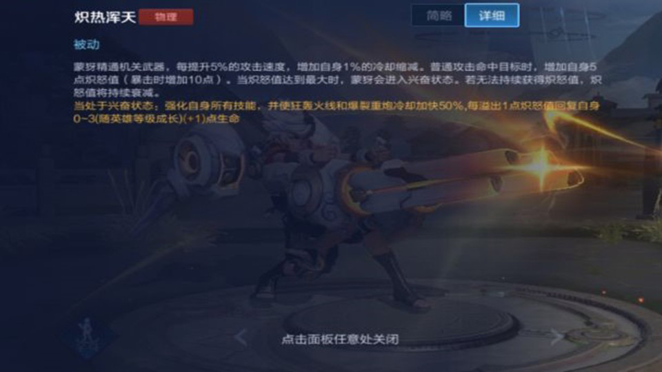蒙犽的被迫每进步5%的攻击速度,就能添加1%的冷却减缩,由于一旦暴击他的炽怒值由5点添加到10点,这就又很需求暴击。当炽怒值到达最大,蒙犽就会进入振奋状况,这时将强化他本身一切技术,并使1技术和2技术冷却加快50%,每溢出1点炽怒值将回复本身生命。