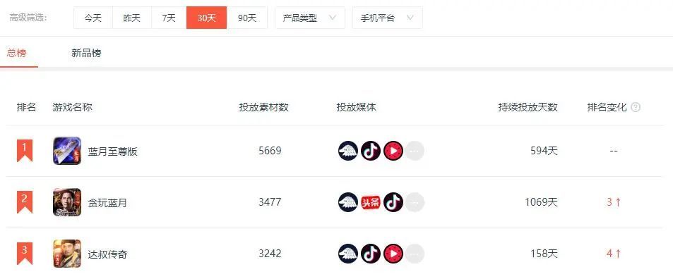 据DataEye—ADX数据途径显现,最近30天传奇类投进力度TOP3的3款产品投进资料数在3200~5700条之间