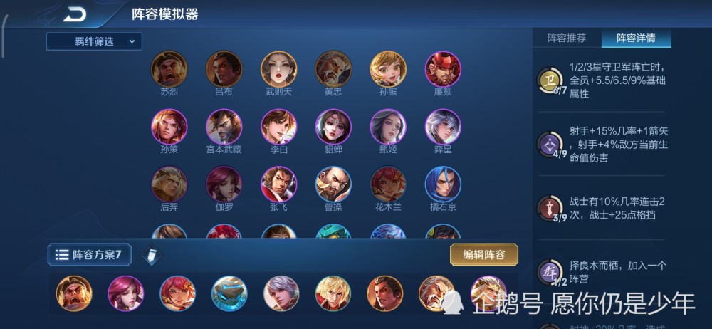 长城射有好几种玩法,当时介绍的是6长城(沈梦溪玄策在外)+吕布+后羿+黄忠。前期优先选坦克配备(优先给木兰),如果有末世那就以后羿为中心(末世相对于后羿便是神器),如果是暴击攻速装以黄忠为中心。天分优先坚持阵型,该阵型三星木兰十分强,玩过的玩家应该知道。