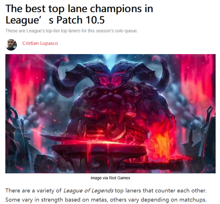 英豪联盟现已更新到了10.5版别,在这个上单被“严峻”加强的版别里,不少近战英豪兴起。而测验服还更新了长途英豪对防护塔镀层损伤削减17%的设定,让不少AD玩家苦不堪言。能够很明显看到拳头官方是想增加上单英豪在团战中的戏份,而AD英豪现在只能稳到后期,才干有所体现。最近外媒DotEsports宣布了一篇长文,并且还介绍了几个在10.5版别比较强势的上单英豪。