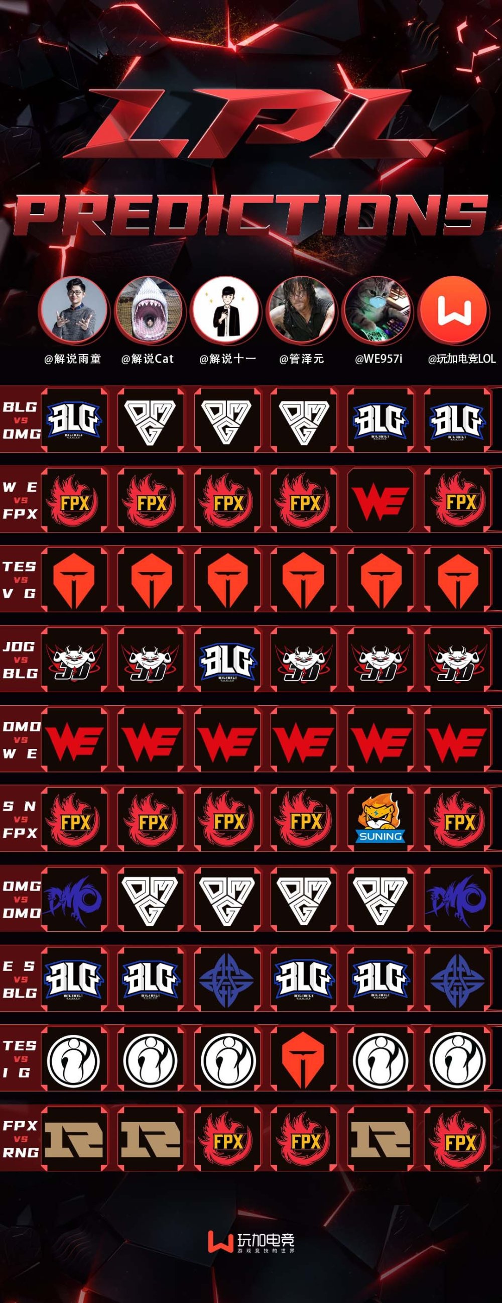 我们最等待的说明猜测环节来啦!相对来说本周的不合点也并不太多,有必要留意一下的是管哥是仅有猜测TES打败iG的说明,而957则支撑了WE和SN别离打败FPX。十一和玩加猜测了ES打败BLG,雨童和Cat在两场OMG的竞赛上都持有相反定见!