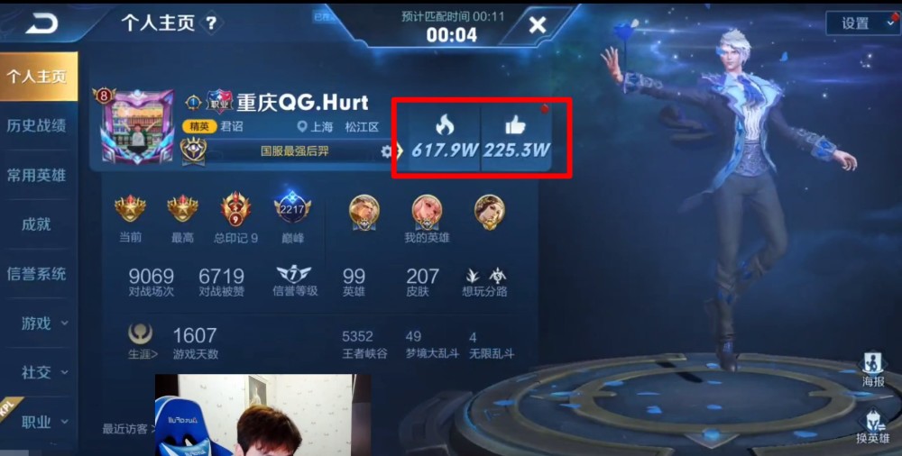 咱们选的样本是QG.happy的射手hurt,他在主页上的人气值以及点赞数十分奢华,点赞数有200多万,人气值更是有600多万,看来一般玩家的面板底子就和hurt的比不了,那么那些大主播和其他的工作选手呢?