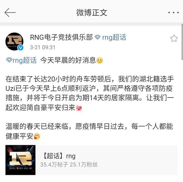 工作是怎样的呢,我们别急,听小编一一道来。因为湖北疫情严峻,许多湖北籍选手很难顺畅脱离湖北回到各自的基地,在3月21日上午9点31分,RNG官博宣布布告!AD位选手Uzi成功从湖北老家回到上海。这一趟行程是简骄傲姐姐开了20多个小时的车,十分辛苦才把uzi和女朋友带回上海。可是因为疫情原因,枣子哥被逼要在家自我阻隔14天。