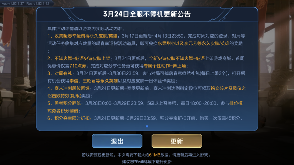 这次更新的更新包并不算大,只要61兆。可是更新内容却让玩家们目不暇接,尽管没有对一般形式的英豪做出调整,但推出了一系列活动,其间最受欢迎的莫过于不知火舞首款史诗级皮肤上线还有皮肤碎片再次更新新皮肤!玩家们的皮肤碎片都预备好了吗?
