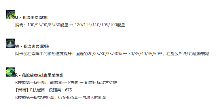 尽管设计师这样做了,可是阿卡丽在归纳数据上仍然一泻千里,渐渐的变多的玩家开端不愿意去运用她了。经过了这几个版别的调查,设计师或许认识到了这样的一个问题,因此在最新的测验服里,阿卡丽迎来了一次不错的加强: