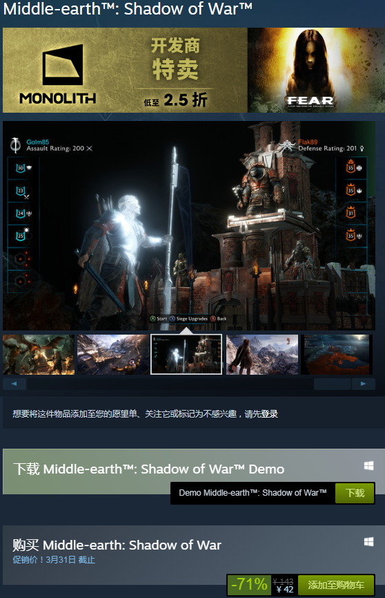 《中土国际: 阴影魔多(Middle-earth: Shadow of Mordor)》关于魔戒粉来说可彻底下手,令粉冷艳,可是游戏不支撑中文汉化是硬伤,介怀的亲勿入。现在该作在Steam上整体被评为特别好评,周末特惠,不只有半价礼包出售,更有多款DLC相同打折促销中。