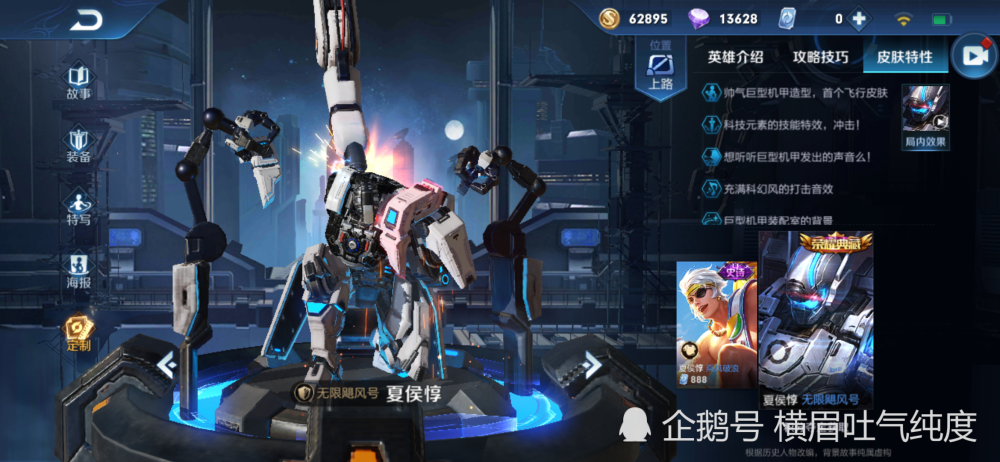 首先说无限飓风号,夏侯惇的一款机甲系列皮肤,这款皮肤是一款典藏皮肤,因为价值很高,导致这款皮肤许多玩家买不起,这款皮肤质量却十分棒,一款改动英豪的皮肤,穿戴这款皮肤像变了一个英豪。