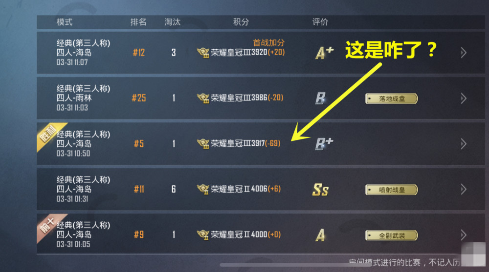 上图所示是一位皇冠玩家的游戏记载:第九名,筛选1个人,+0分;第11名,筛选6个人,+6分;第五名,筛选1个人,-69分;第25名,筛选1个人,-20分;第12名,筛选3个人,+20分。看完这些记载后,小伙伴们必定会被第三局游戏的分数招引了,为什么这位玩家拿到了第五名,可是却被扣了69呢?就算这位玩家在四排形式中落地成盒了,可是也应该和上面的25名相同,扣20分才对呀。这到底是咋回事呢?不只这位玩家不明白了,就连网友们也表明疑问,有网友说“这是我见过扣分最多的一局游戏,一般来说扣50分都十分罕见了”,有网友说“就算是战神落地成盒,也不能扣这么多吧”,也有网友说“真狠,扣一次直接掉段了”等等。小伙伴们,你们觉得是什么原因导致的呢?欢迎留言共享您的观念。
