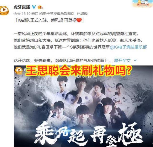 囧王者在之前的文章中写到过,任何一家渠道要想找到互联网尖端网红王思聪去做嘉宾,不只要花费巨资,还要搭上情面。而签约IG战队之后,就约等于变相的签约了王思聪,IG在哪里,王思聪就会去哪里刷礼物,这不便是变相的签约了王思聪吗?现在的问题是,4月8日,王思聪会刷多少礼物给IG的队员了。看是“舔狗”Rookie拿得多,仍是当红炸子鸡Theshy拿得多罢了。