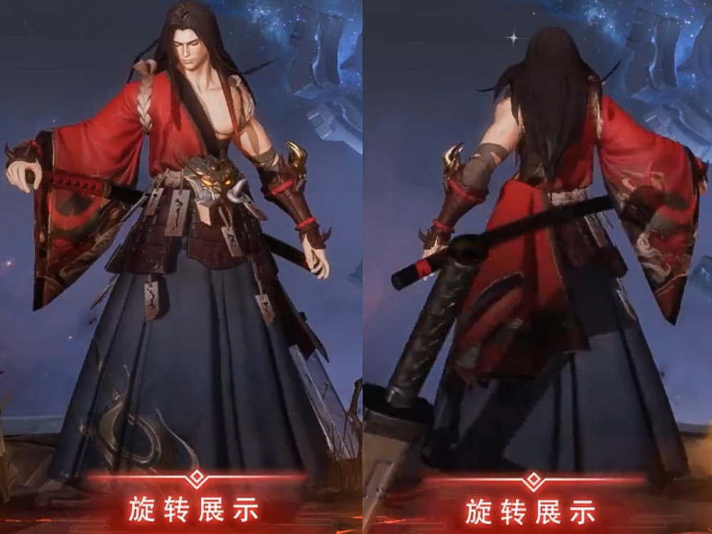 首先看橘右京修罗的皮肤建模展现,赤色上衣,黑色武士裙子,加上这左面显露来的健壮的胸肌,哪怕修罗是看不见的瞎子,可是闭着眼睛的橘右京,这个英俊的姿态仍然让玩家觉得修罗十分酷,并且隐约还泄显露一点点霸气。
