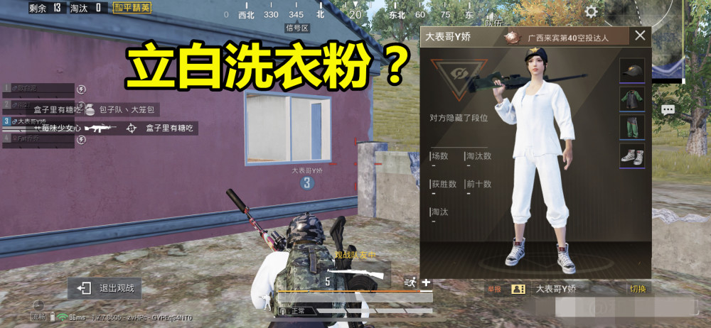 最近平和精英被白衣军占据了,上图所示玩家被筛选后观战敌人打游戏,发现敌人穿戴一身白色的衣服,点开材料栏后能够正常的看到这位玩家的衣服真的是太白了,就像用“立白”洗过了相同。